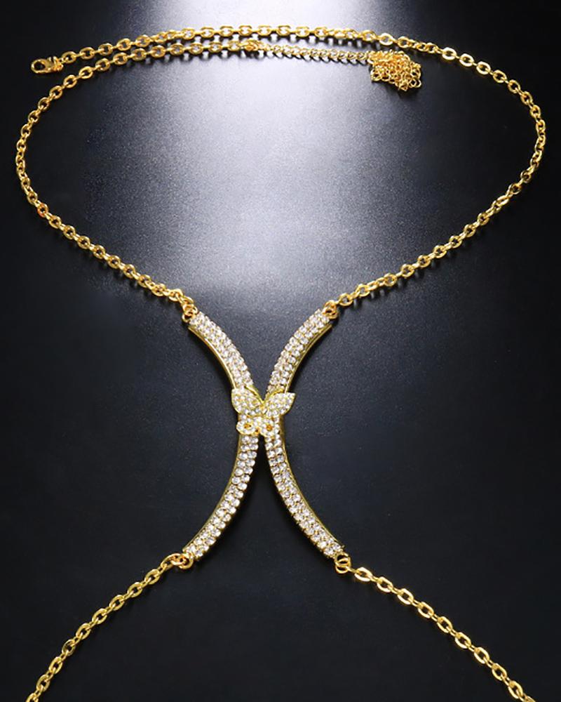 X Shaped Butterfly Decor Rhinestone Body Chain, Gold