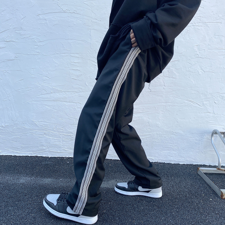 New Masculinas 2021 Primavera Outono High Street Estilo Retro Webbing Sweatpants Hip-hop Linha Reta Solto Drape Juventude OHOH, Black