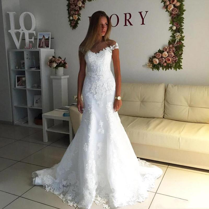 Custom Made Off Shoulder Full Lace Mermaid Wedding Dresses with Appliques Sweep Train Plus Size Wedding Bridal Gowns, Ivory