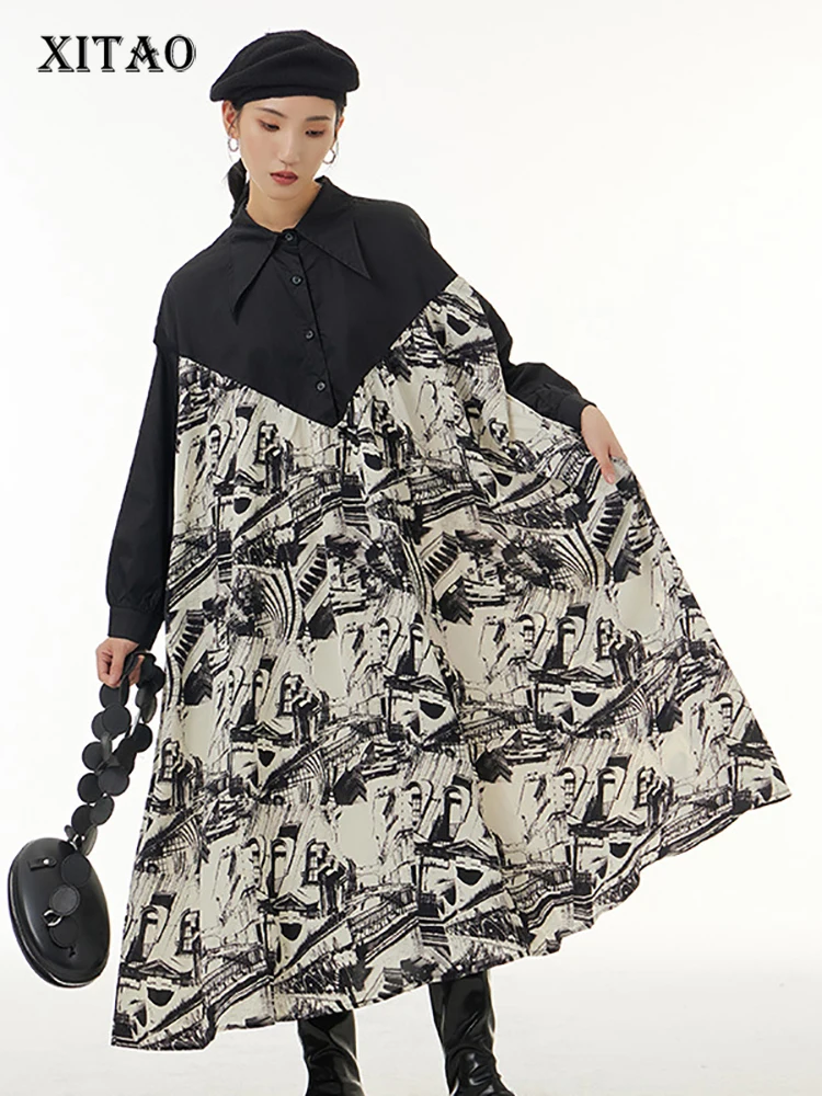 XITAO модное Повседневное платье-рубашка с асимметричным контрастным принтом, женское платье с длинным рукавом, Осеннее свободное платье, нов...