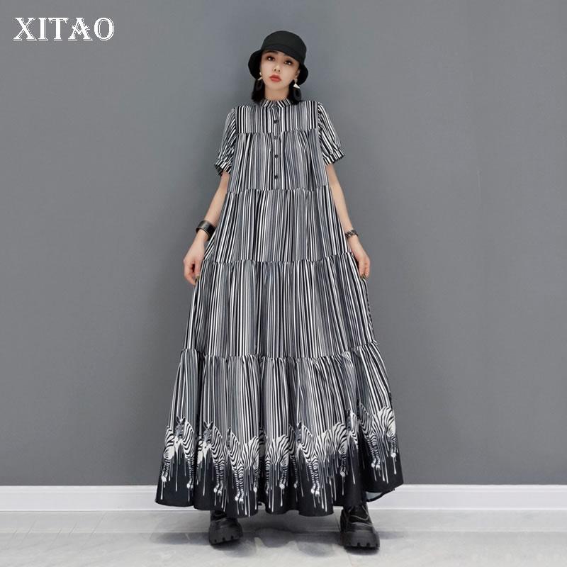 XITAO полосатый принт сращивания кекс платье модный воротник-стойка большого размера свободные женские повседневные свободные модные CLL1111