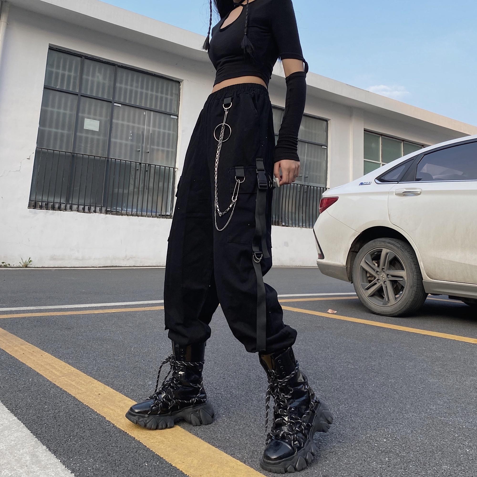 Y2K Женская одежда Унисекс Панк-цепочка Черные брюки-карго Уличная одежда Хип-хоп с высокой эластичной талией Повседневная мода Harajuku Летние шаровары для женщин S чёрный