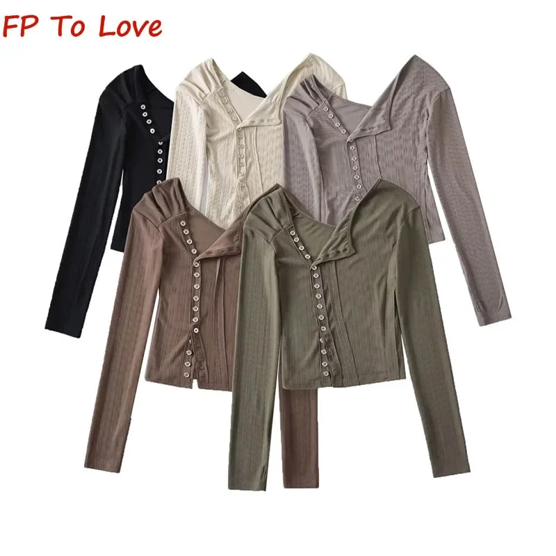Y2K сексуальный дизайн для девушек Спайс косые плечи однобортная футболка с длинным рукавом женский тонкий Асимметричный топ