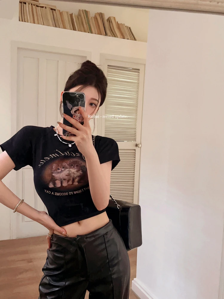 Y2k винтажные футболки с рисунком кота, женская черная футболка, эстетические гранж-топы для E-girl, американские фотообои 2023