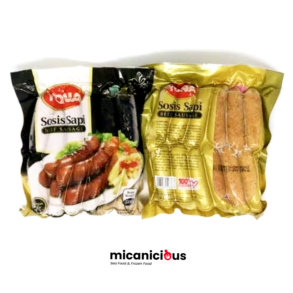 Yona sosis sapi bakar terbuat dari campuran daging sapi dan ayam. Walaupun ada campuran daging ayam, tapi komposisi daging sapinya lebih banyak kok jadi pasti rasa sapinya terasa banget. Selain dibakar, sosis ini juga cocok untuk digoreng, rebus/kukus dan campuran masakan lainnya seperti pizza, spaghetti, tumis sayur, dll.