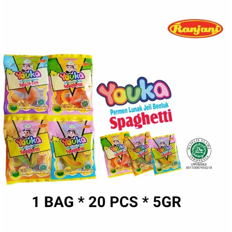 Permen Youka Spagetti Gummy Candy Adalah Permen gummy candy yang mempunyai bentuk seperti mie spaghetti memiliki tekstur kenyal jelly.