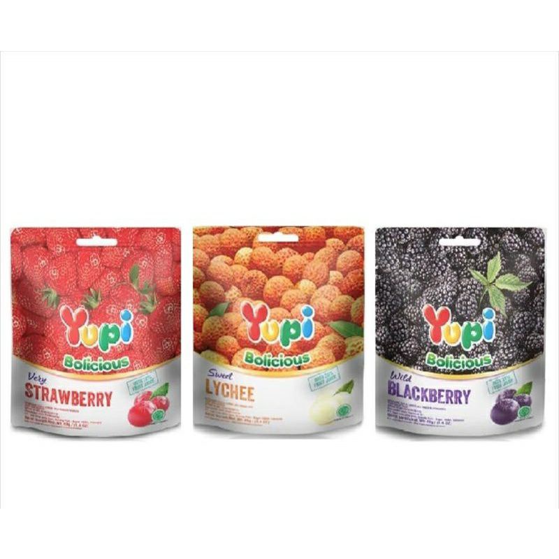 Yupi Bolicious, berupa permen lunak jeli bulat dgn rasa buah. Permen ini dirasa begitu berbeda dan spesial sesuai tema yg diusung, dalam setiap pcsnya menggunakan bahan jus buah 20% dari seluruh komposisinya. Jadi permen ini akan terasa banget rasa buahnya sesuai varian yg ada. Dikemas gn kemasan standing pocuh ber ziplock. Ber BPOM dan Halal MUI.