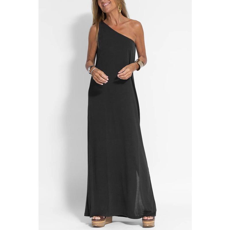 YYFS Женская мода Лето Весна Однотонный принт Без рукавов Косой воротник Свободная линия талии Повседневные платья XXL чёрный