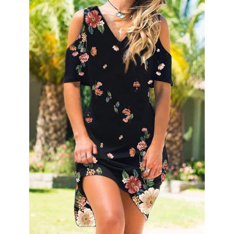 YYFS Женская мода Лето Весна Цветочный узор Принт Короткие рукава V-образный вырез Высокая талия Повседневные платья XXXL