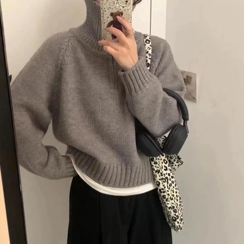 YYFS Женская мода Повседневный Осень Зима Однотонный Принт Длинный Рукав Поло Воротник Свитера One Size серый