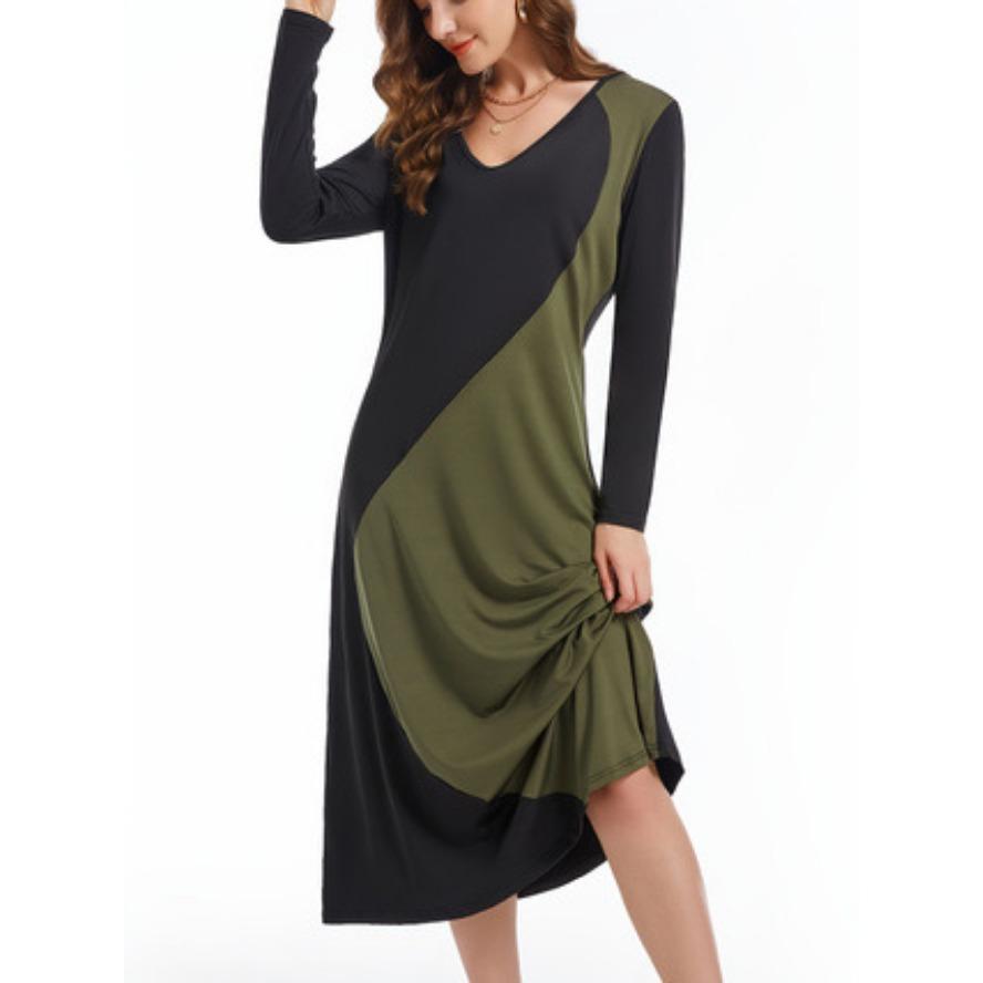 YYFS Женская мода весна-осень цветные блоки принт длинный рукав V-образный вырез высокая талия повседневные платья S армия зеленый