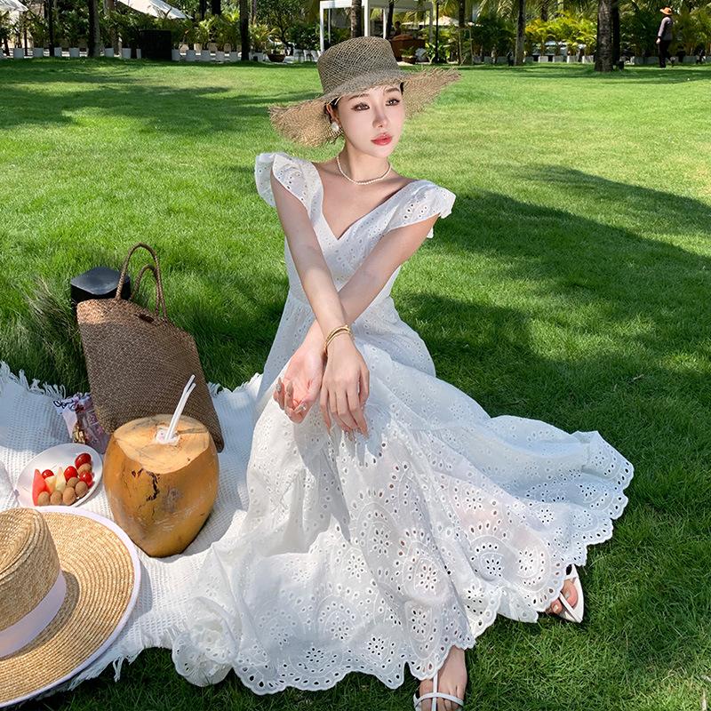 YYFS Женская мода лето весна однотонный принт без рукавов V-образный вырез высокая талия повседневные платья L бежевый