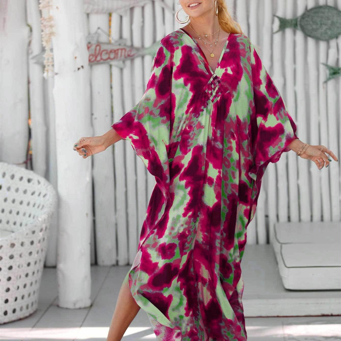 YYFS женская мода отпуск лето весна цвет блок принт с длинным рукавом v-образным вырезом повседневные платья One Size ярко-розовый