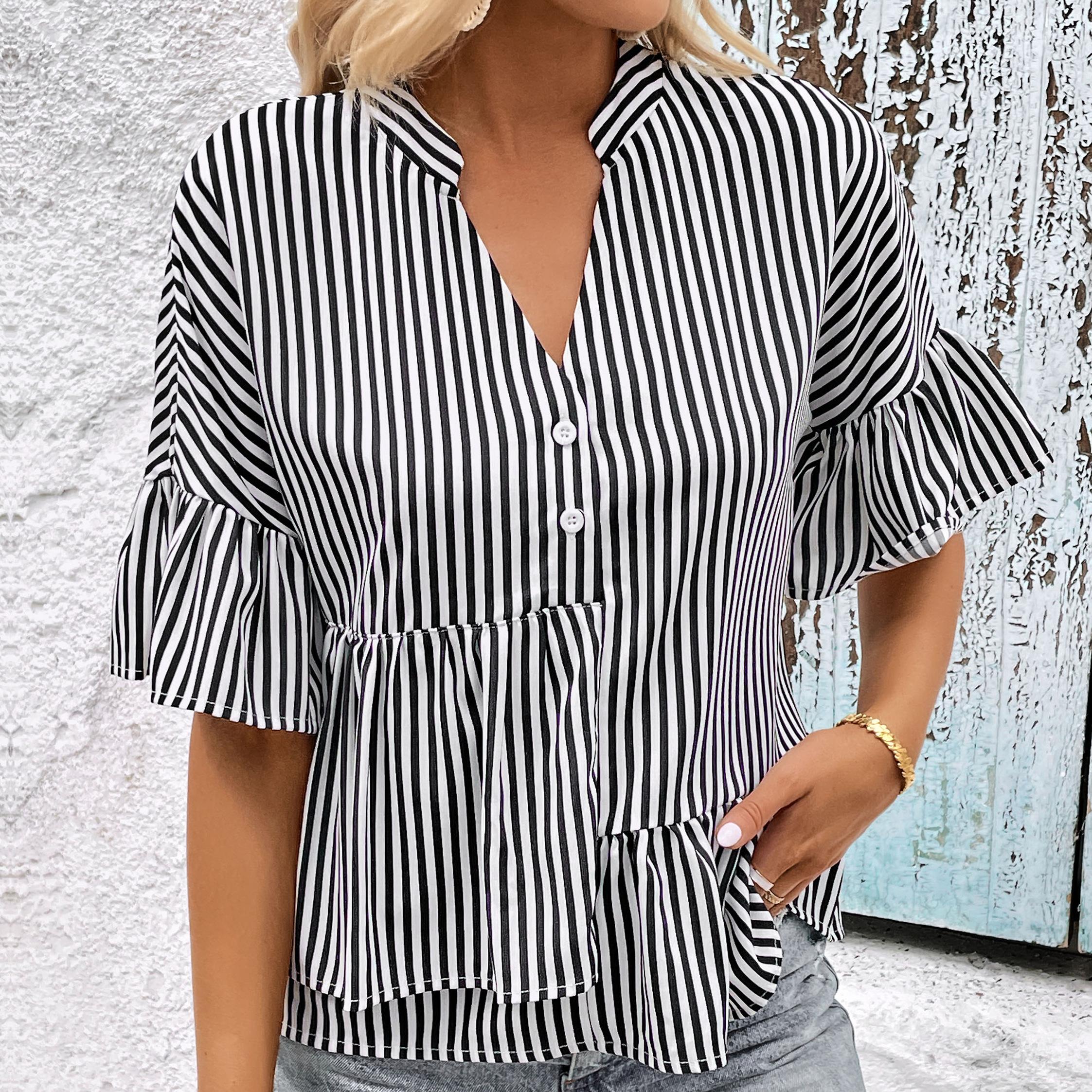 YYFS женские модные повседневные блузки и рубашки с v-образным вырезом и короткими рукавами в полоску с принтом S чёрный