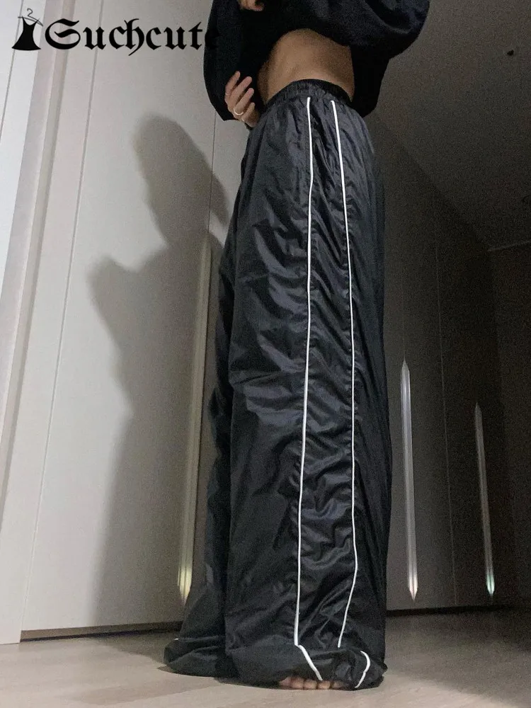 SUCHCUTE Sporty Casual Side Striped Wide Leg Pants Women Korena Vintage Casual Low Waist Aesthetic Baggy Trousers Streetwear 90s