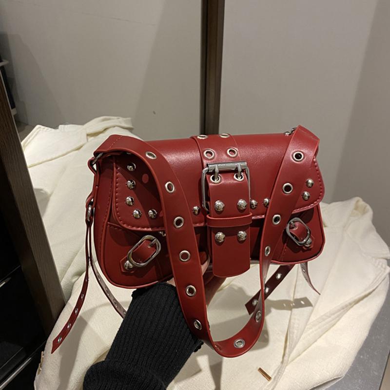 Yogodlns Модная женская сумка через плечо в мотоциклетном панк-стиле, однотонная, модная, с заклепками, для поездок на работу, маленькая квадратная сумка под мышкой 23x6.5x13.5cm красный