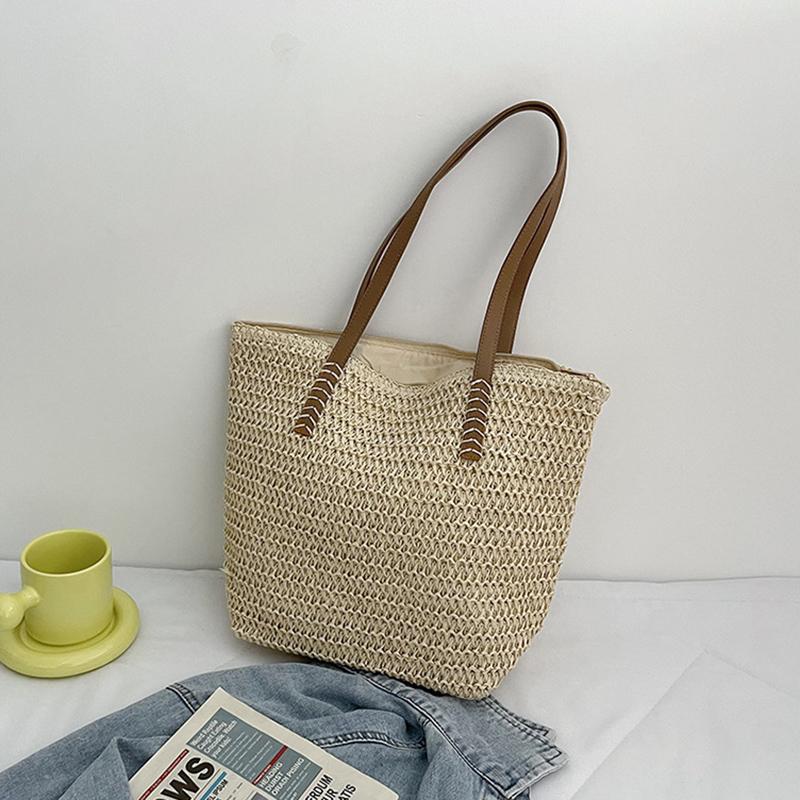 Yogodlns летняя тканая женская сумка большая вместительная сумка из ротанга на плечо для отдыха приморская пляжная сумка повседневная сумка-шопер 32*14*33cm бежевый