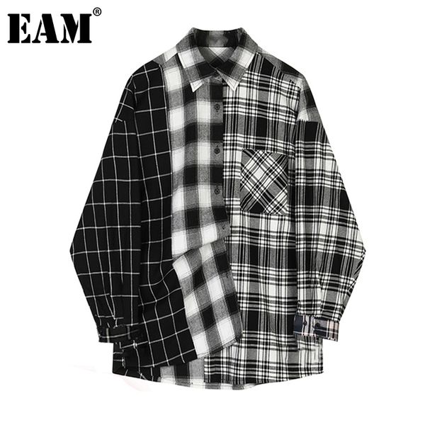 women's blouses & shirts [eam] women black plaid split big size blouse lapel long sleeve loose fit shirt fashion tide spring autumn 202, White