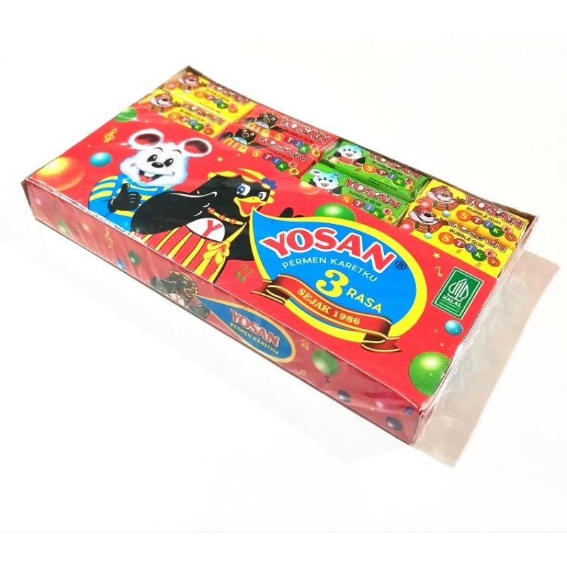 Permen karet merek Yosan yang memiliki 3 rasa: stroberi, melon, dan jeruk.