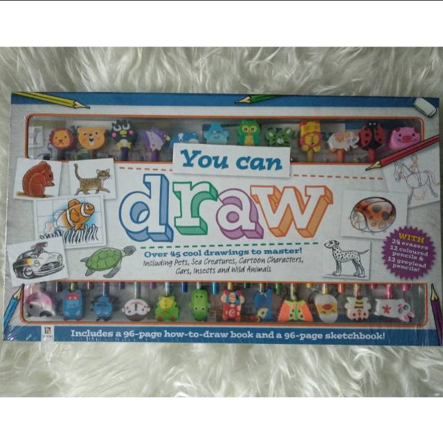 Termasuk 96 halaman 'bagaimana untuk menggambar' dan 96 'halaman untuk menggambar', termasuk penghapus dan pensil..
