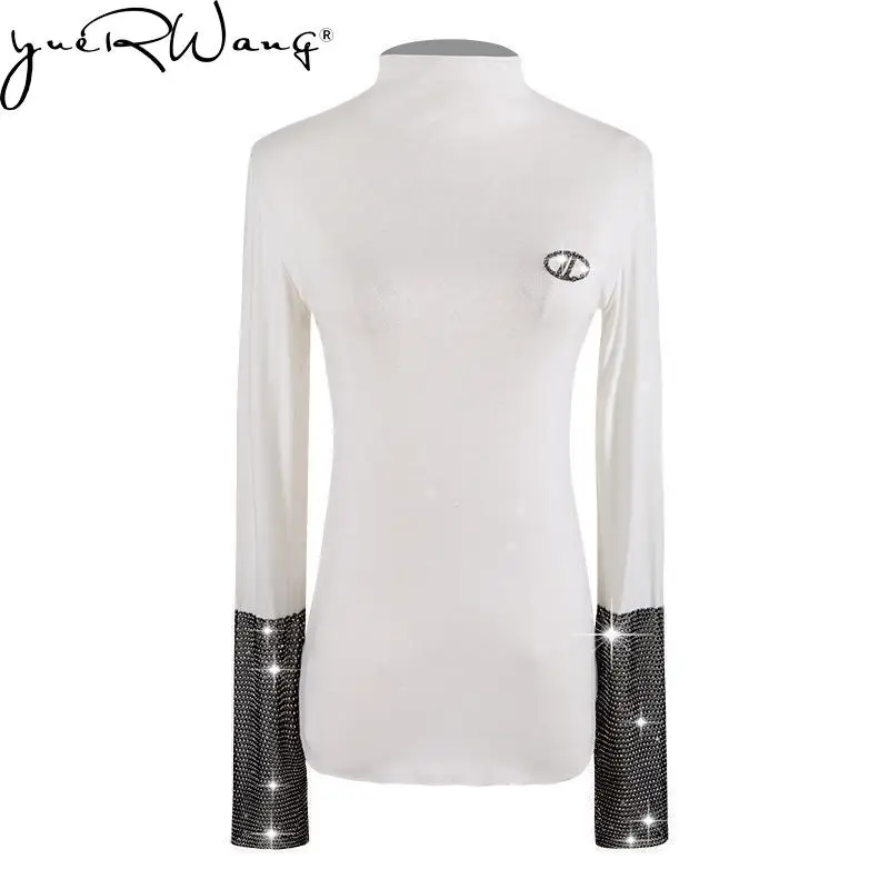 Yuerwang женская футболка с воротником-стойкой с длинным рукавом, женские футболки, топы, Лоскутная Женская футболка со стразами, модные футболки, женские топы