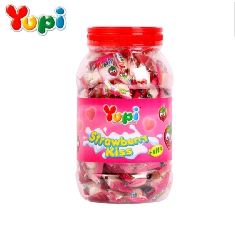 permen yupi rasa strawbery dalam kemasan toples