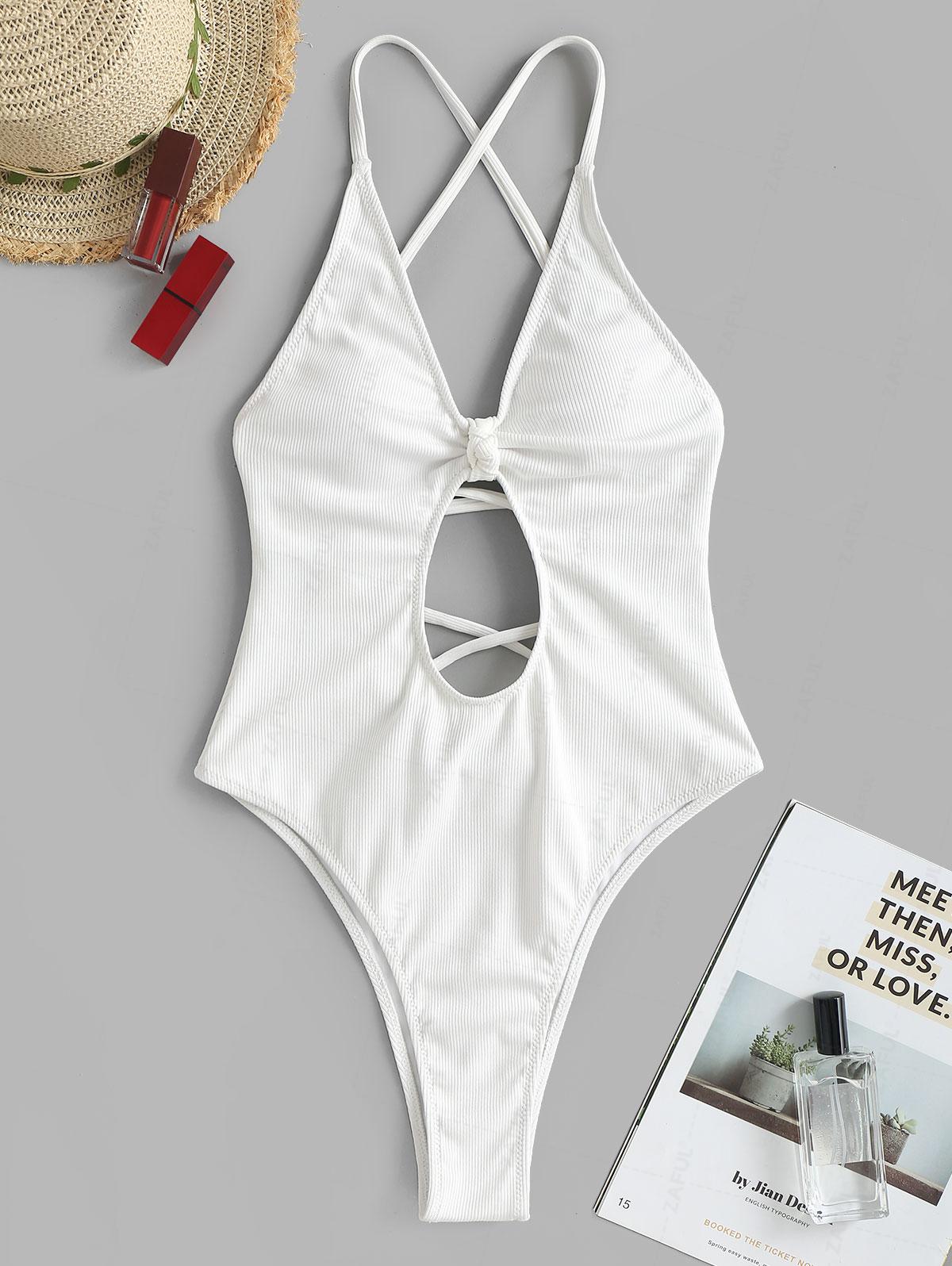 ZAFUL Слитный купальник с узелками, ребристым узором и перекрещивающимися бретелями L белый