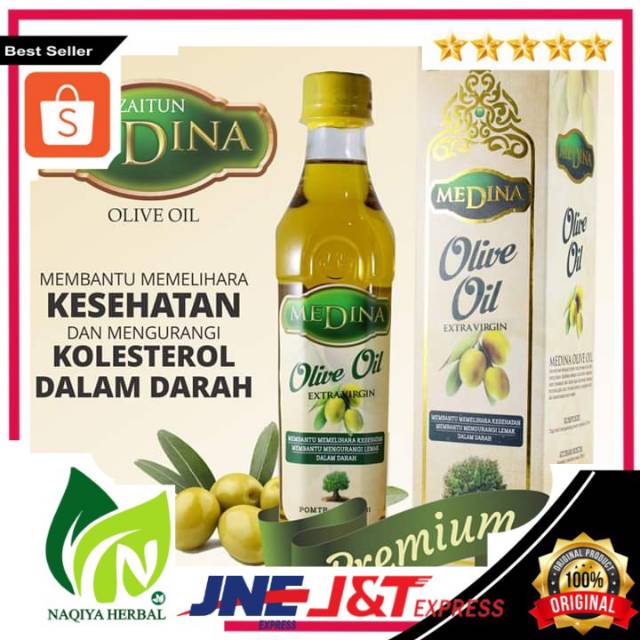Minyak ZAITUN MEDINA adalah minyak zaitun perasan pertama yang dihasilkan dari buah zaitun yang matang dan segar yang diambil dari daratan yang terbentang luas diolah dengan menggunakan teknologi first cold pressed sehingga menghasilkan minyak zaitun yang terbaik dan berkualitas tinggi yang bebas dari kolesterol. Komposisi Bahan Minyak Zaitun Extra Virgin Medina : Minyak Zaitun ( Ekstra Virgin ) Khasiat Minyak Zaitun Extra Virgin Medina : 1. Menjaga kesehatan jantung 2. Meningkatkan kadar kolesterol baik atau HDL 3. Dapat membantu penurunan berat badan 4. Mencegah kanker 5. Mencegah osteoporosis atau pengeroposan tulang 6. Mengatasi rambut rontok 7. Mengatasi bibir kering dan pecah-pecah Khasiat Minyak Zaitun Untuk Wajah : 1. Menunda proses penuaan dini 2. Mengatasi wajah berminyak 3. Mengangkat kotoran di wajah 4. Menghilangkan strech mark 5. Melembabkan kulit wajah dan segudang manfaat lainnya. Aturan Pakai Minyak Zaitun Extra Virgin Medina : Minyak Zaitun Medina ini dapat anda konsumsi langsung maupun dioleskan sebagai obat luar. Untuk dewasa pemakaian yang dianjurkan adalah 3 x 3 sendok makan setiap hari setelah makan, dan anak-anak 3 x 3 sendok teh setiap hari.