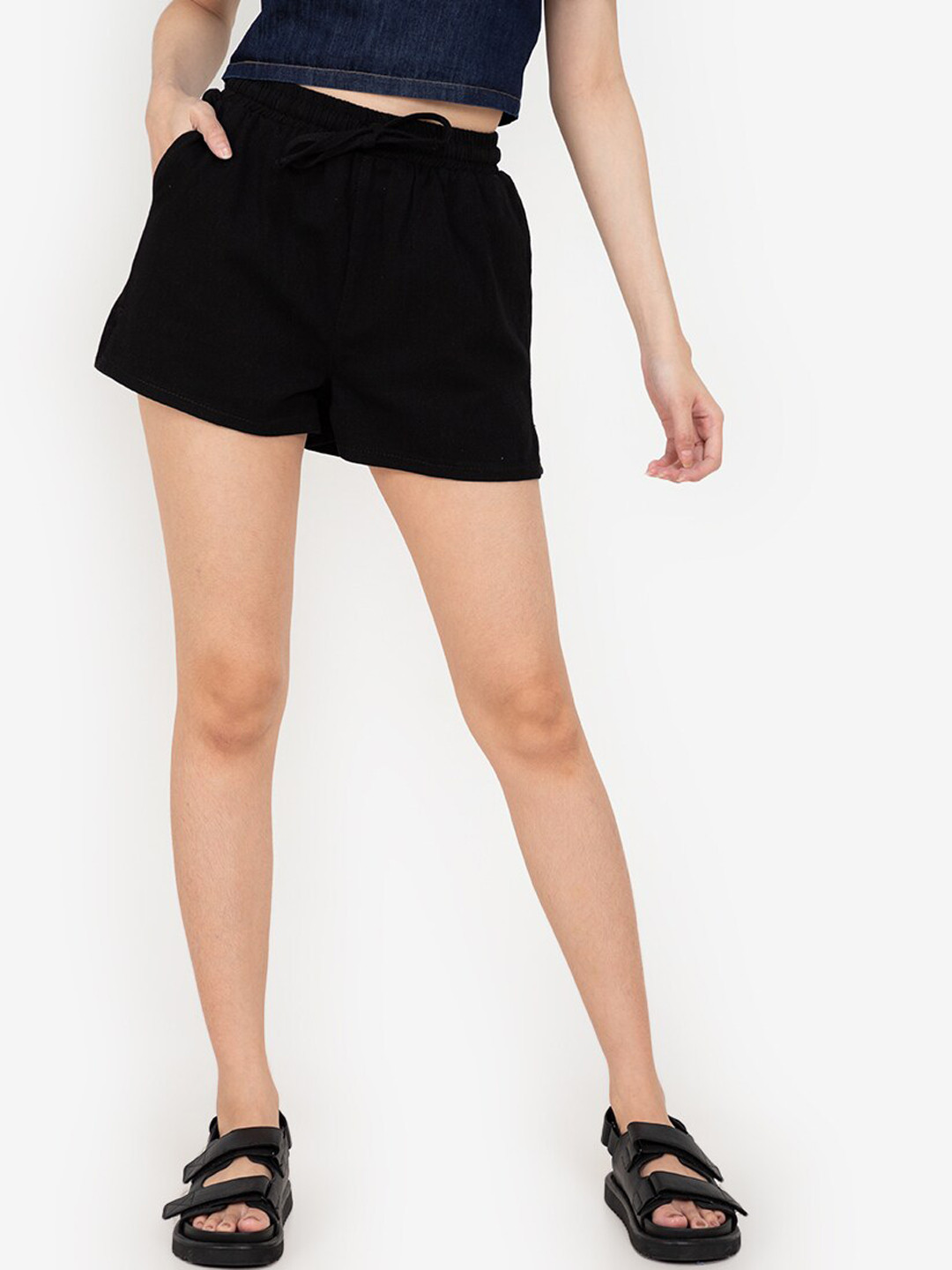 Black solid high-rise regular shorts, has 2 pockets, drawstring closure