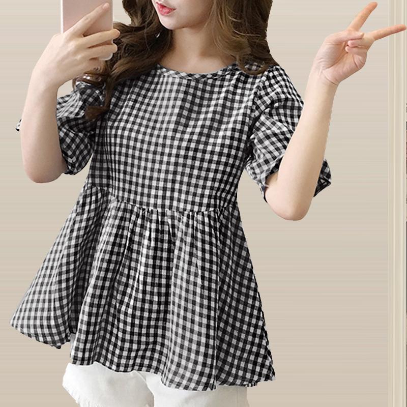 ZANZEA Женская повседневная блузка с короткими рукавами и круглым вырезом в клетку с принтом 2XL чёрный