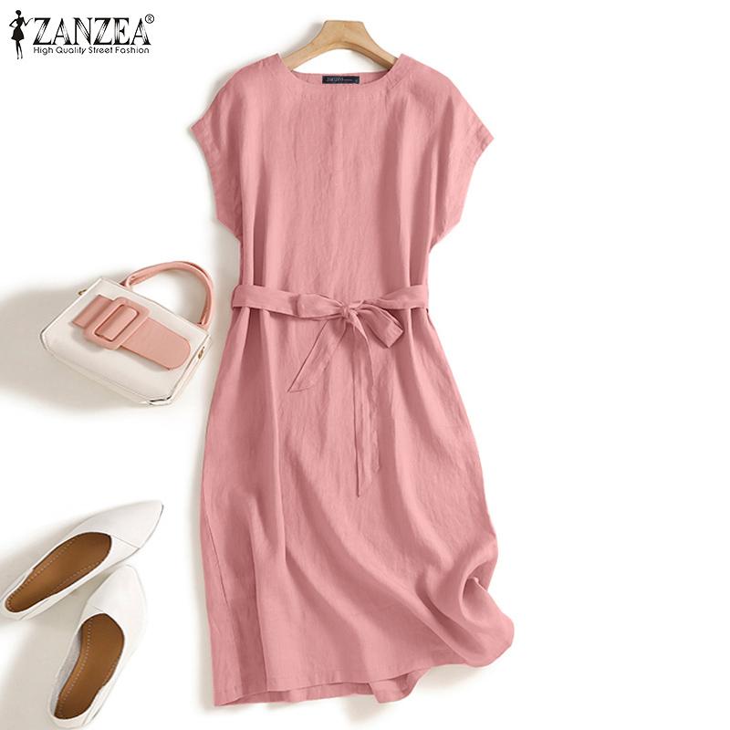 ZANZEA Женское хлопковое повседневное простое платье с круглым вырезом и короткими рукавами
