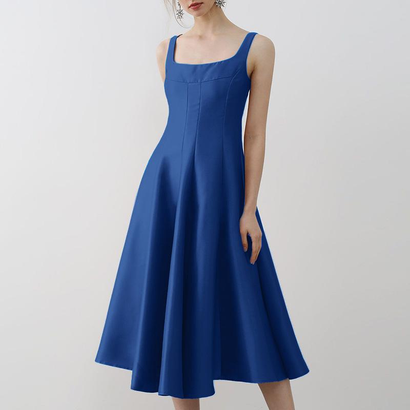 ZANZEA Праздничное Повседневное Платье А-силуэта с Квадратным Вырезом, Приталенное, Летнее, Без Рукавов M синий