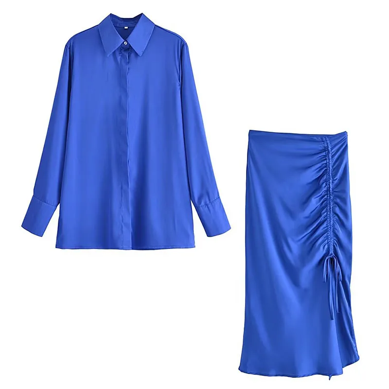 ZATRHMBM шикарная женская рубашка с длинным рукавом шелковые-атласные модные женские блузки 2022 пуговицы отложной воротник синие Базовые Женск...
