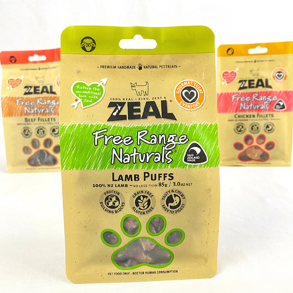 Zeal Free Range Naturals Lamb Puffs Dog Treats Camilan Anjing 85g100% NZ Lamb LungsHigh Protein, Low FatSuitable for cats & dogs of all sizesMade in NZZeal Free Range Naturals Lamb Puffs Cat & Dog Treats are 100% pure natural NewZealand lamb treats. High in protein and low in fat, they are suitable for cats& dogs of all sizes. Easily digestible, tasty and aromatic, Lamb Puffs are greatsmashed and sprinkled over food as toppers!Ingredients100% NZ Lamb Lungs
