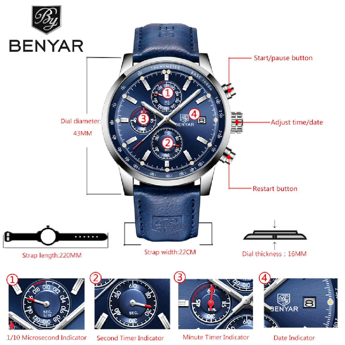 Часы BENYAR Мужские кварцевые с хронографом, люксовые брендовые модные спортивные автоматические с датой и кожаным ремешком