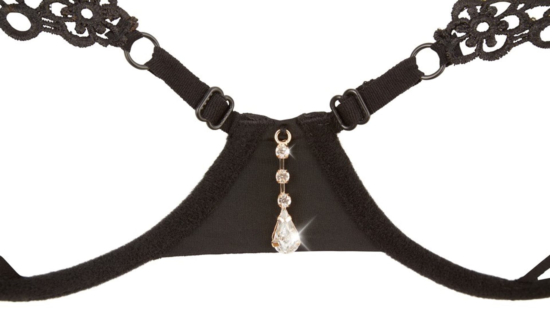 Minimalistic lingerie for maximum effect! The bra with open cups is just made out of wires and straps which gives the onlooker an amazing view, especially as the nipples are only covered by embroidery. There is a hook fastener at the back and the straps are adjustable. The matching string is invitingly open in the crotch area and also has beautiful embroidery at the front. The embroidery is joined to the straps by three small silver-coloured rings. Main material 95% Poliester, 5% elastane; embroidery/lace 100% Poliester; string 100% Poliester.