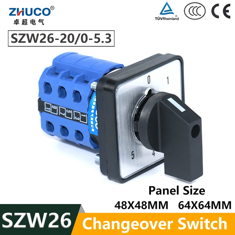 ZHUCO SZW26/LW26-20 0-5 Six Position Three Phase 20A Latching Control Rotary Change Over Cam Switch 64X64 48X48 Mm Panel Mount