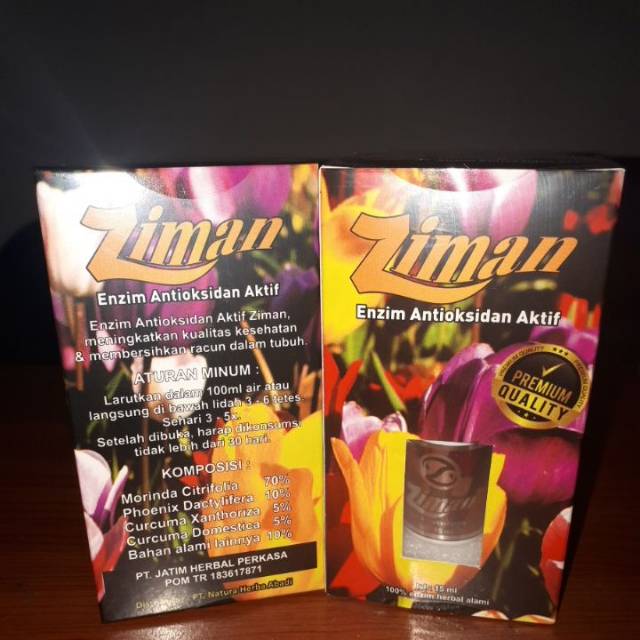 ZIMAN adalah Produk Herbal Tetes yang mengandung enzim antioksidan aktif, yang diproses dengan ekstrasi ganda teknologi paten Jepang menghasilkan enzim antioksidan tingkat tinggi untuk meningkatkan kualitas kesehatan, menjaga tubuh awet muda, membersihkan racun dalam tubuh dan menjadikan sehat.Ziman diekstrasi tanpa proses pemanasan sama sekali sehingga menghasilkan zat antioksidan hidup yang mampu atasi berbagai keluhan. Berbeda dengan produk produk lain yang diekstrasi dengan pemanasan sehingga nutrisi yang terkandung hanya sedikit.Isi 15ml (+/- 300 tetes)100% herbal alami