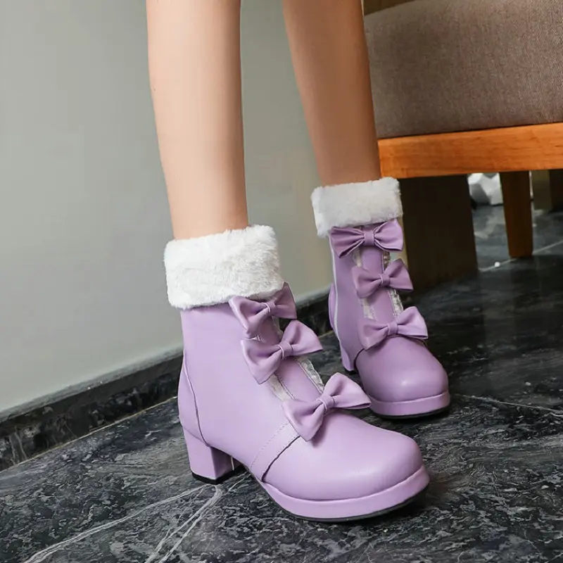 ZawsThia Лолита девушки розовые Фиолетовые женские меховые бабочки с бантиком Милая Дамская форма японские Косплей Зимние ботильоны