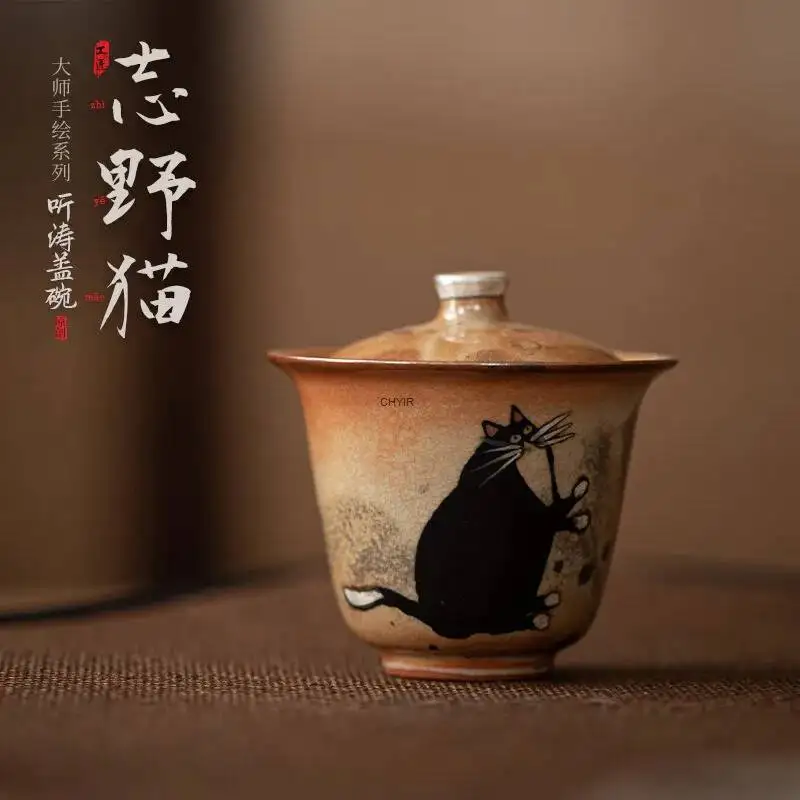 Zhino Cat Tingtao Gaiwan Изменение печи Ercai Gaiwan Керамическая чаша для чая Чашка для чая Имитация дерева Ручная роспись Серебряное ремесло