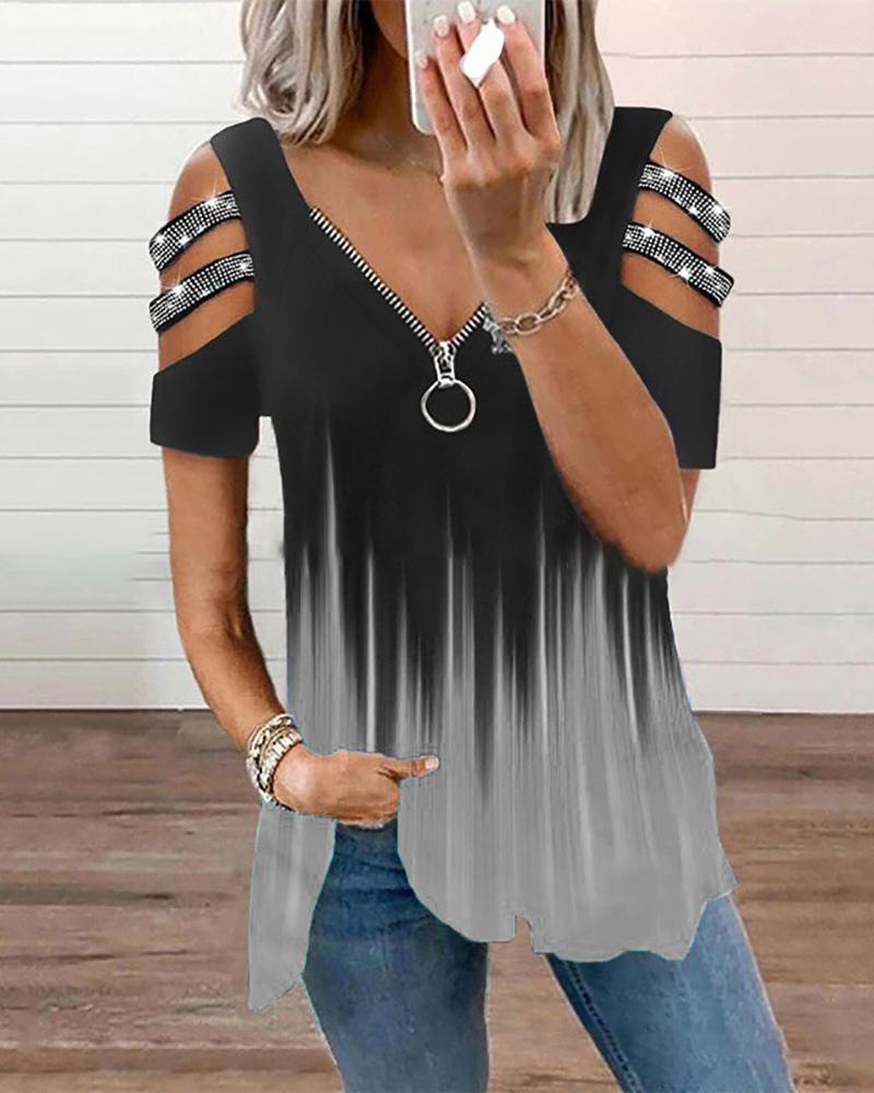 Zipper Design Colorblock Cutout Rhinestone Top, Gray