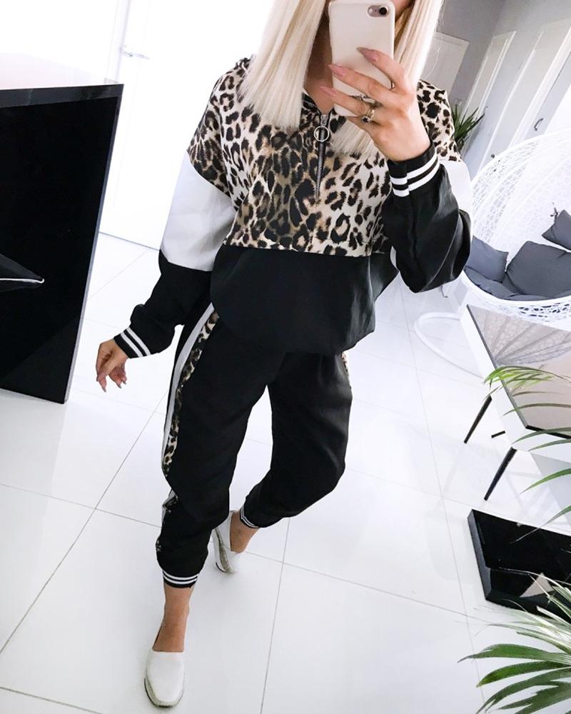 Zipper Design Colorblock Insert Leopard Striped Top & Pants Sets