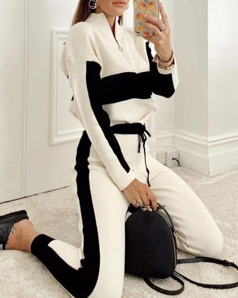 Zipper Design Colorblock Top & Drawstring Pants Set, White