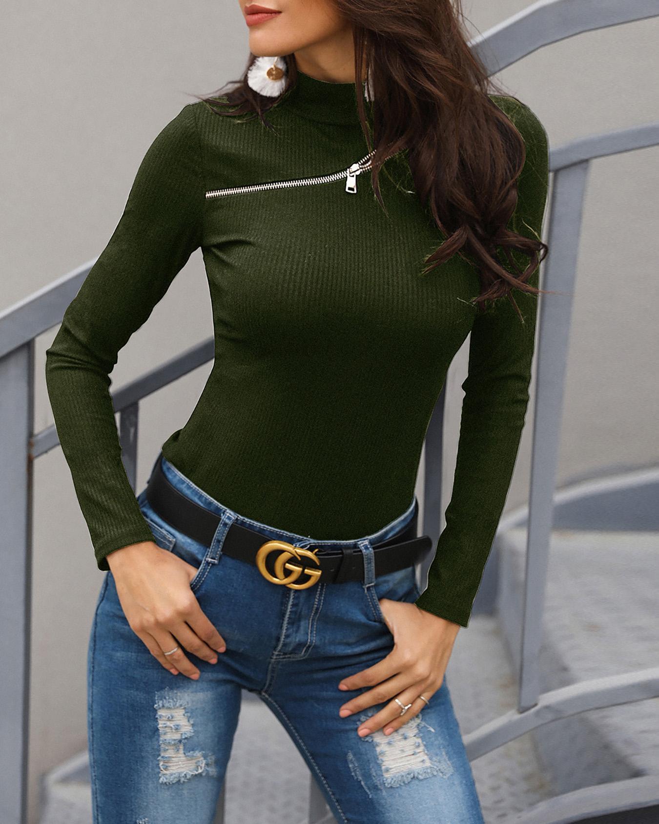 Zipper Design Cut Out Ribbed Sweater, Green