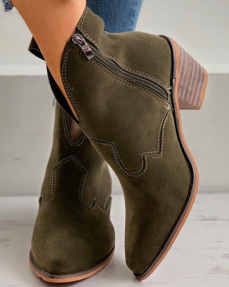 Zipper Design Pointed Toe Chunky Boots, Army green
