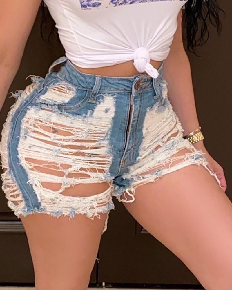 Zipper Design Ripped Denim Shorts, Lighted blue