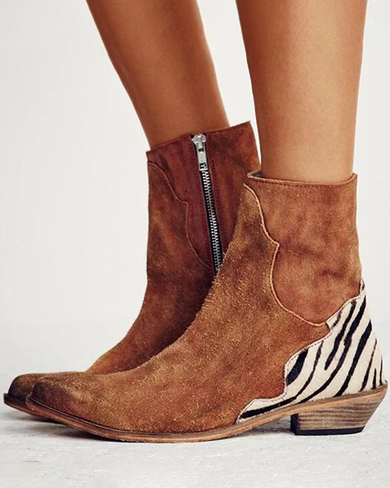 Zipper Design Zebra Stripe Pattern Cowboy Boots, Brown