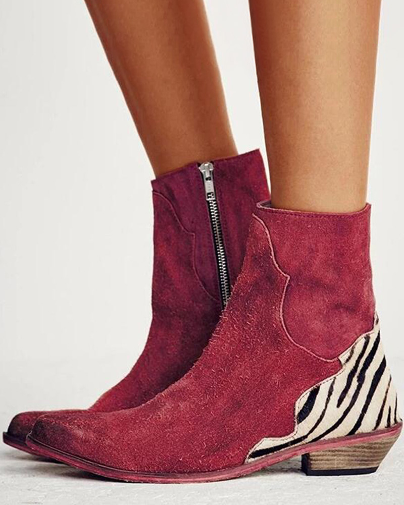Zipper Design Zebra Stripe Pattern Cowboy Boots, Wine red