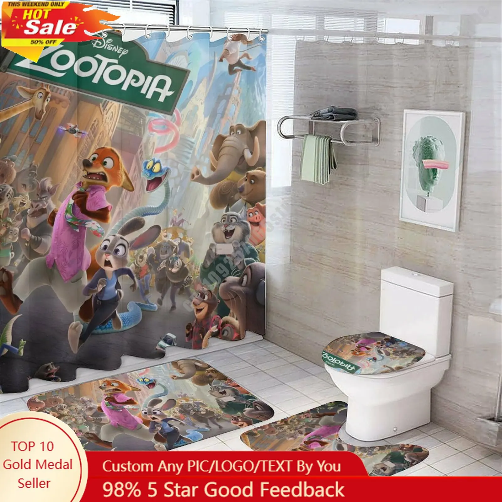 Zootopia Shower Curtain Set Disney Cartoon Pattern Non Slip Rug Toilet Cover Bath Mat 4PCS Decorating Birthday Gift