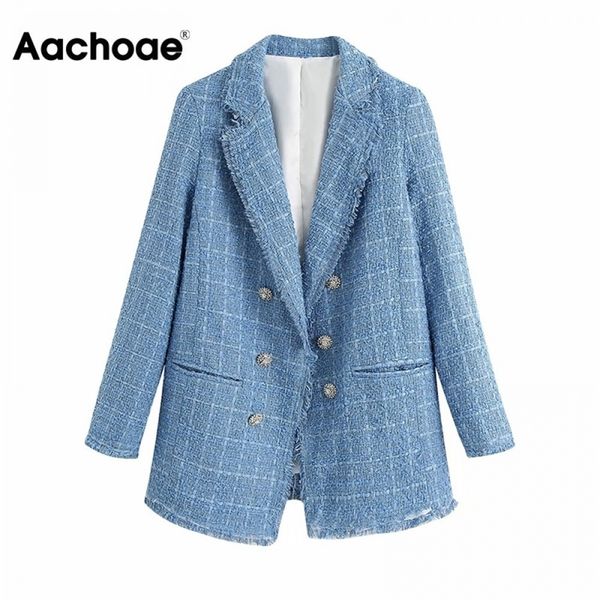 aachoae fashion office wear blue tweed blazer women elegant double breasted jacket coat casual long sleeve pockets outwear 201201, White;black